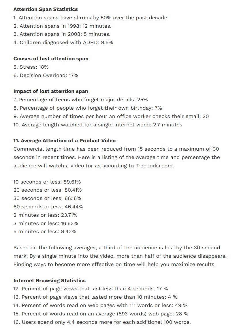 This second factor is much like the first, except it's in relation to external states, as opposed to internal states. However, the definition overlooks the fact that the external and internal - unless one has reached Enlightenment - are always connected. If one is to once again re-read the previous example of how modern man attends to the modern world, that is, he is 'away with the fairies'. One will realize that his internal state is intrinsically linked to external events, a single external event can lead his internal state to devolve into a sleep which can last hours. Of course, as we're now talking about externalities, we can begin to rely on external statistics. Let us look at the statistics regarding attention: